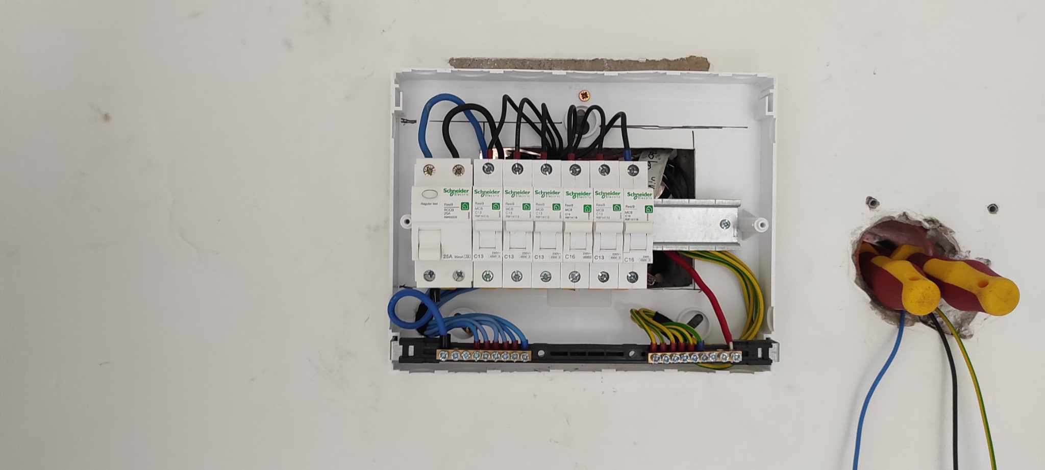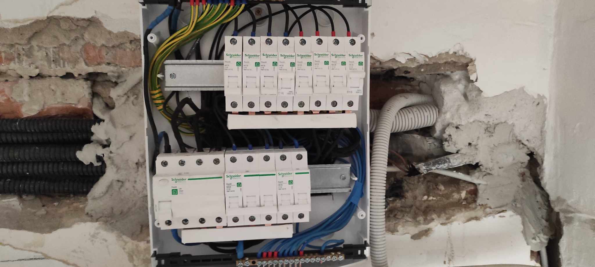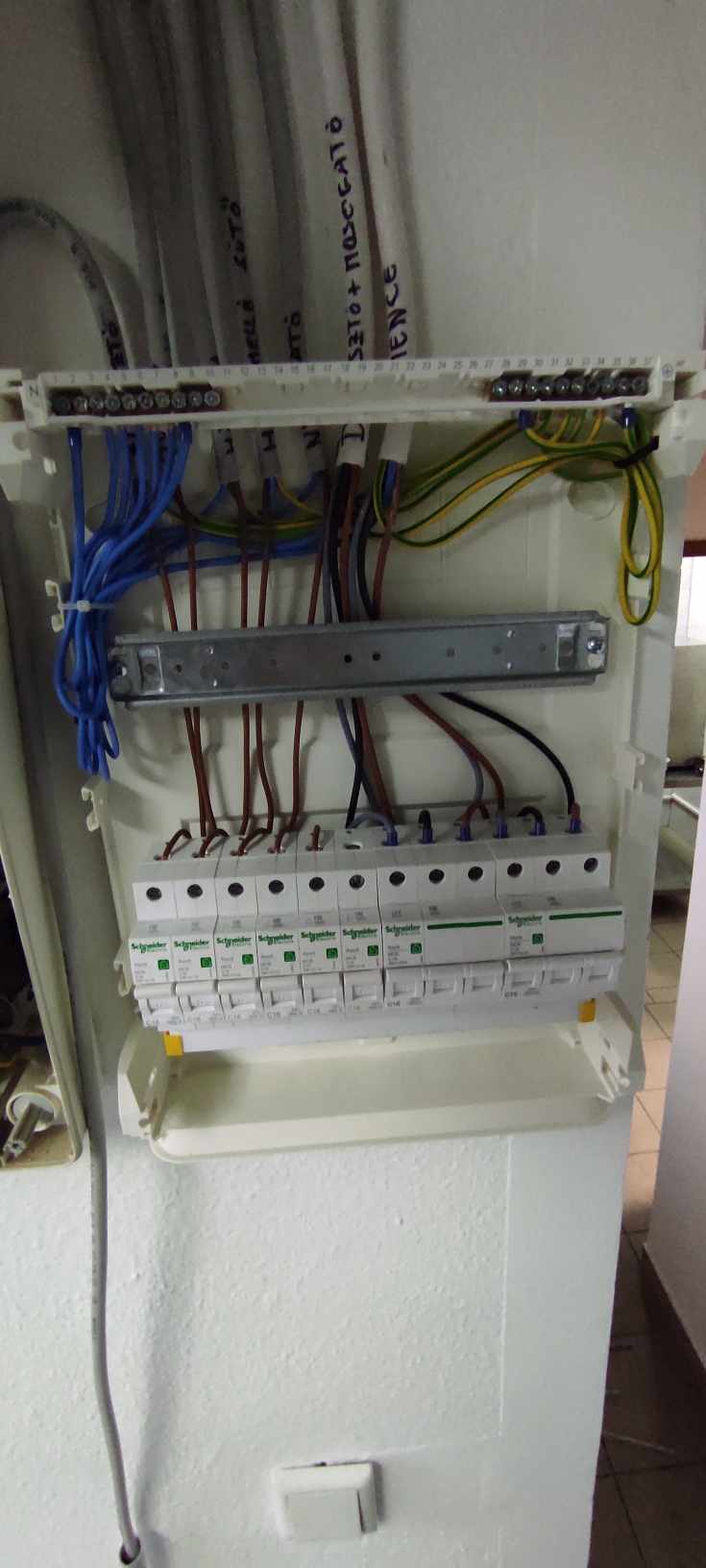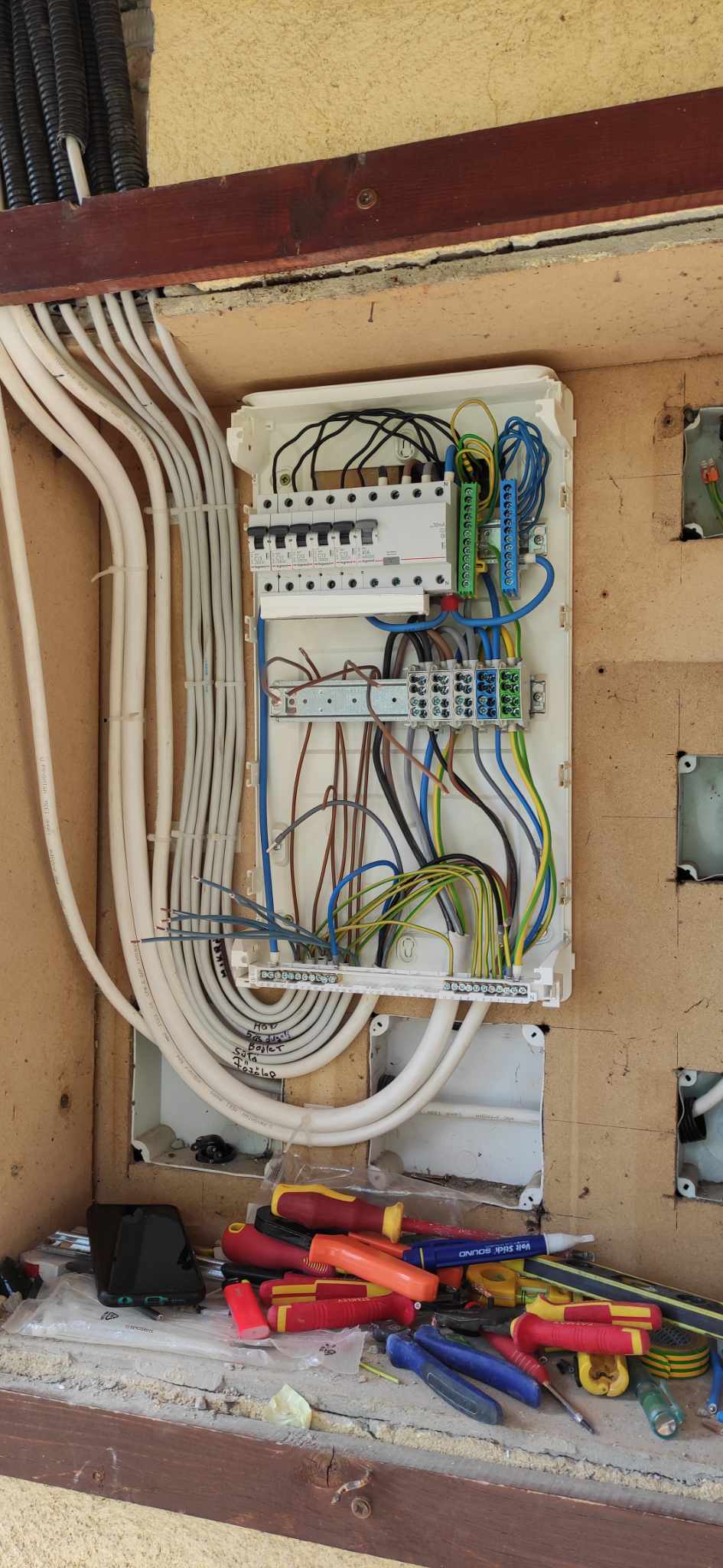 Átvették, de a komplett házat újravezetékeljük a 2. lépésben. Ekkor kerül be a földelés is a házba, és így fi-relét is felszerelünk.