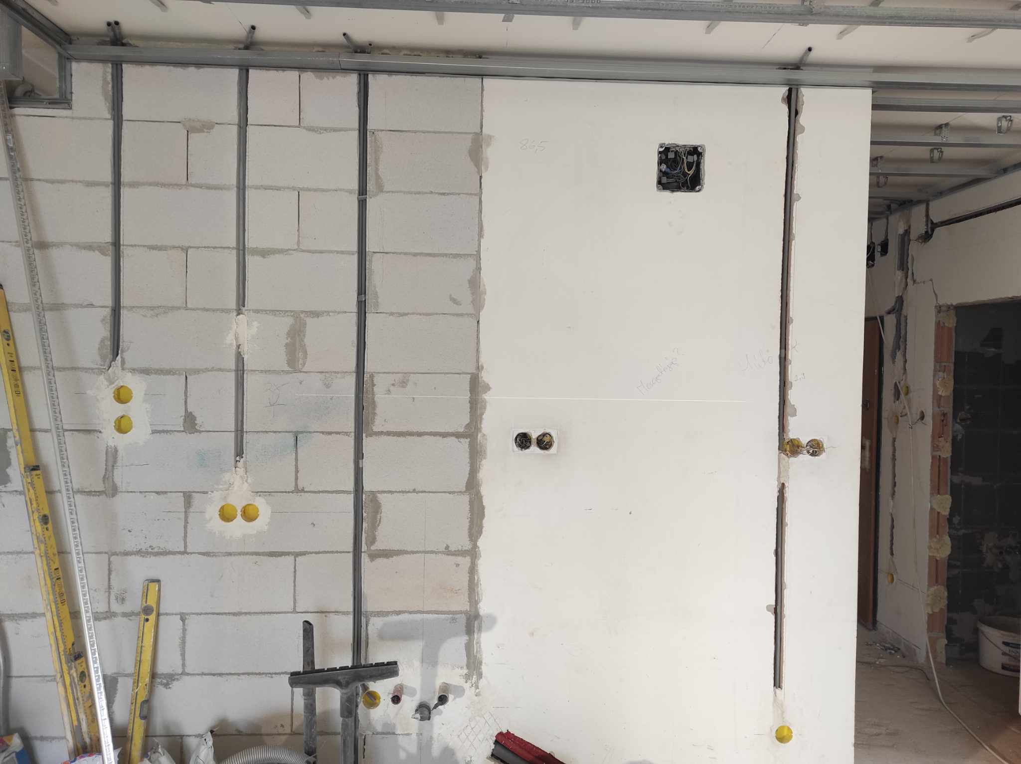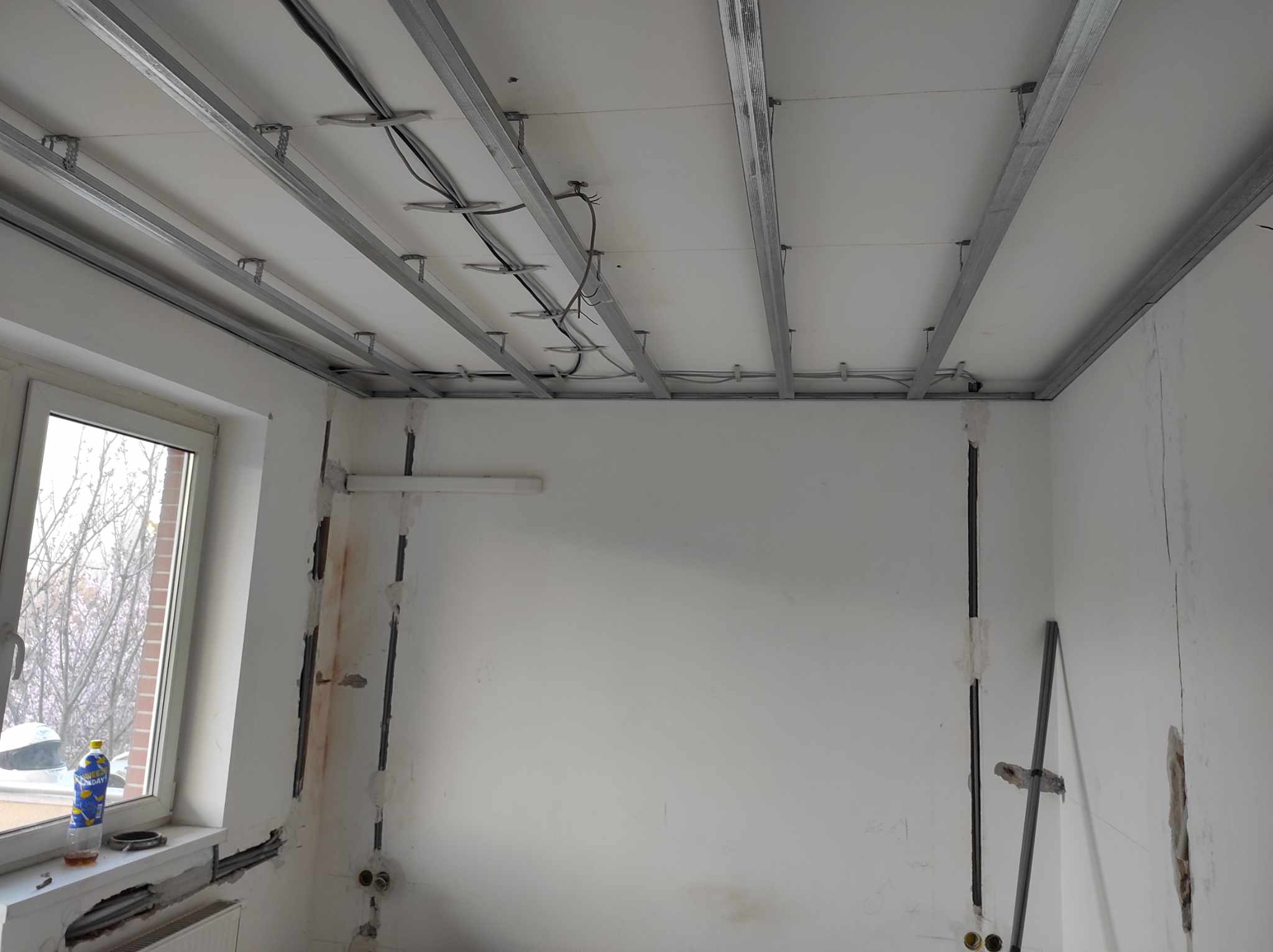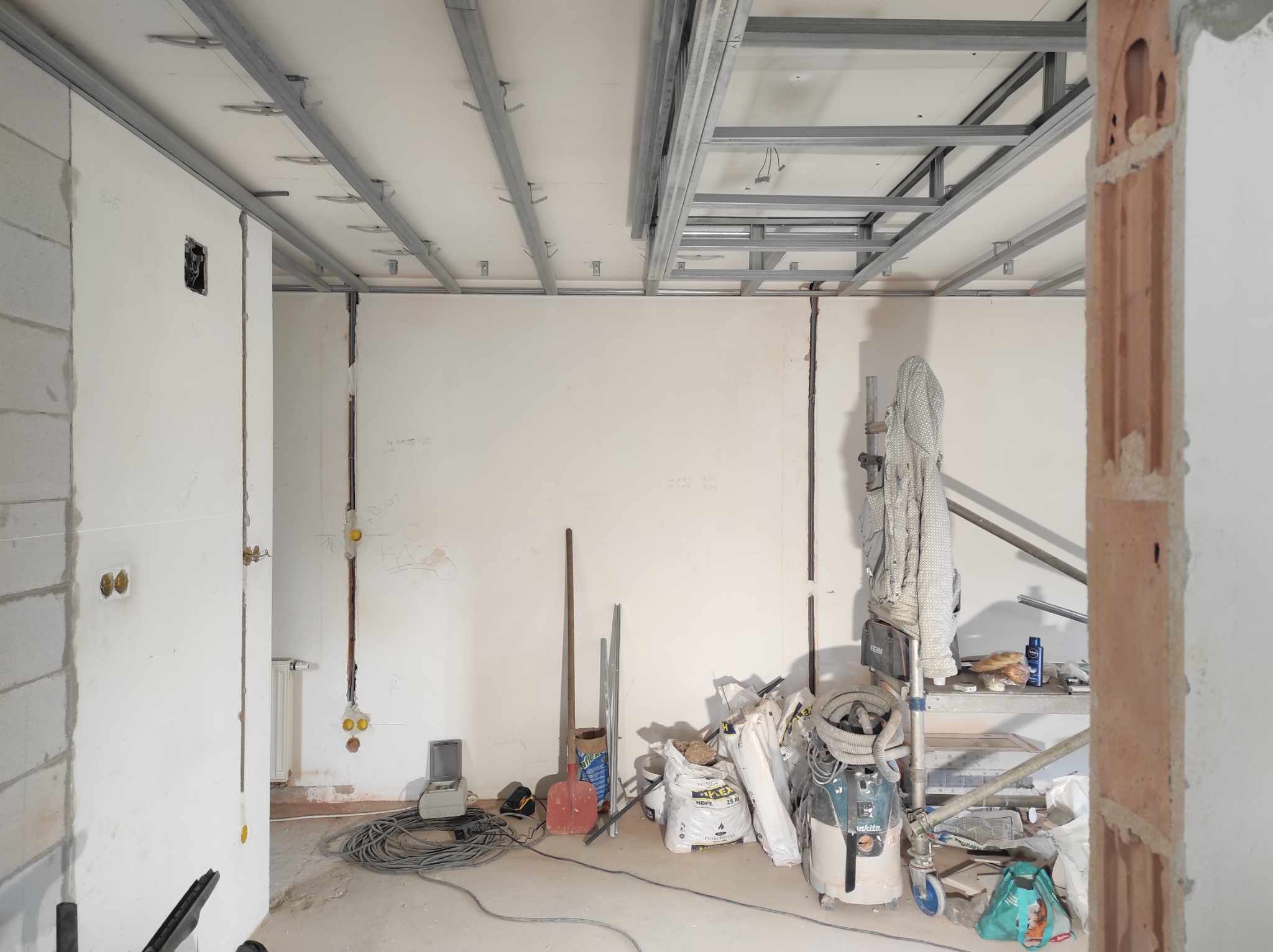 A zárt csövezés az álmennyezet fölött is fontos, hogy bővíthető, javítható legyen a hálózat. Itt gipszkarton előtét falak is lesznek.